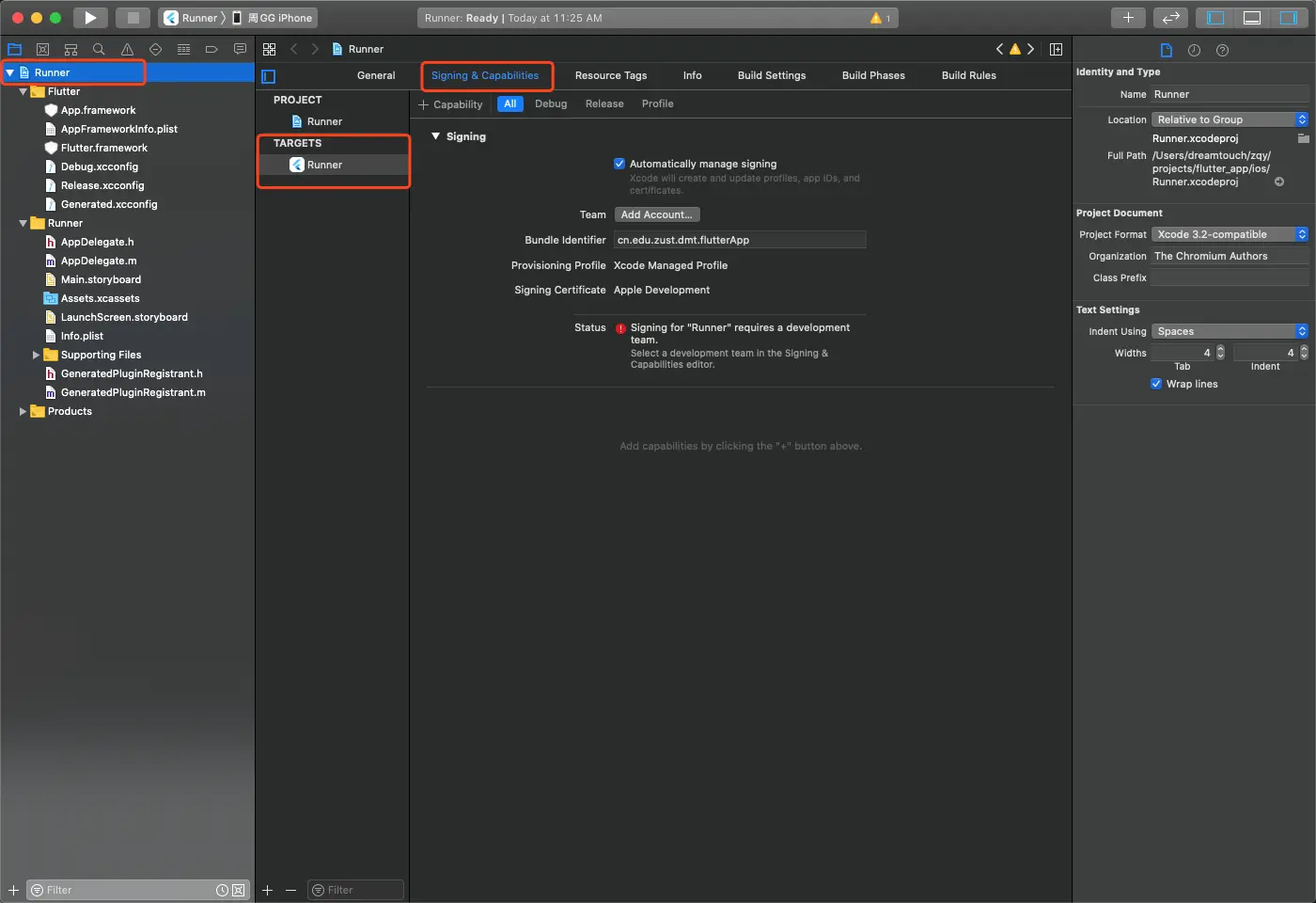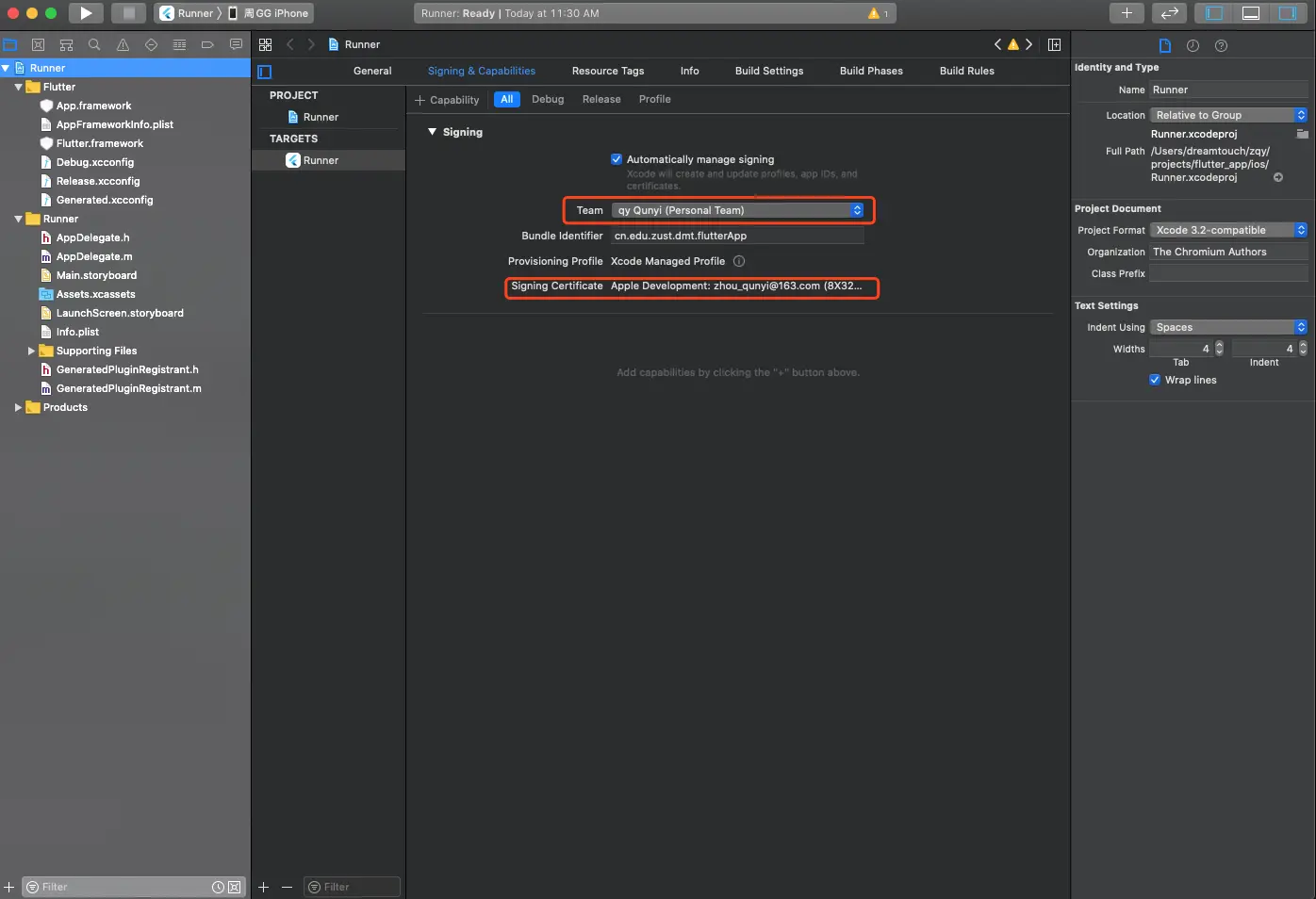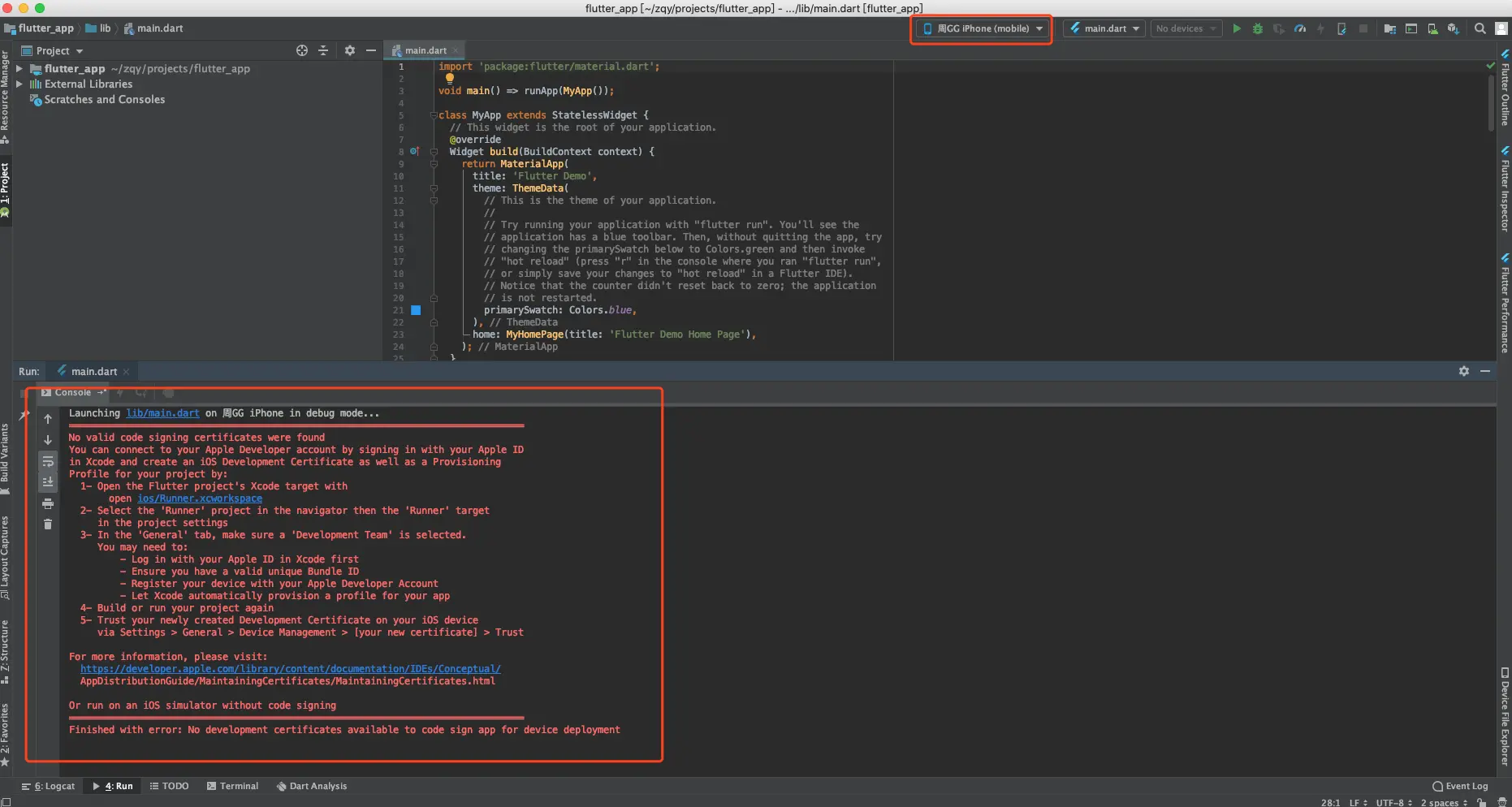 苹果手机通过USB链接电脑,选择信任电脑。在Android Studio里选择连接的苹果设备,运行Flutter App,首次运行时会提示"No valid code signing certificates were found",因为苹果项目需要设置一个iOS开发证书和配置文件(Provisioning Profile):