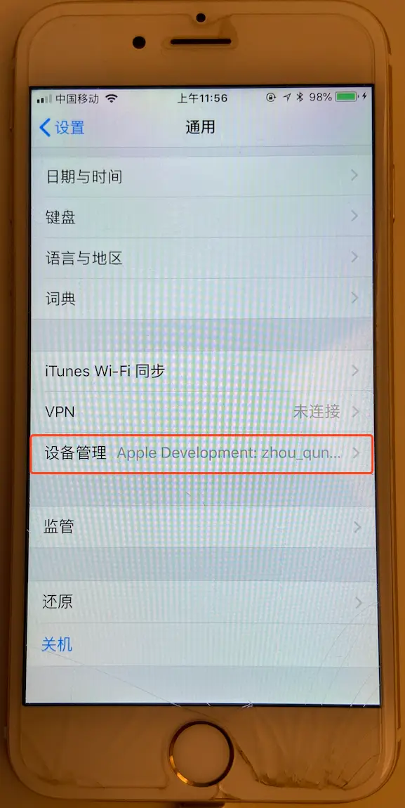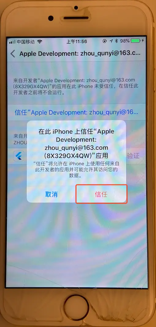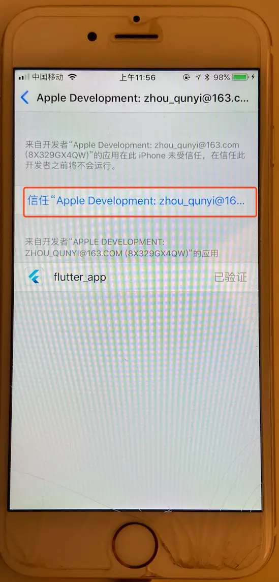 注:需要始终保持苹果设备有一个已经认证安装过的Flutter App,这样可以避免苹果设备重复设置个人开发证书信任。