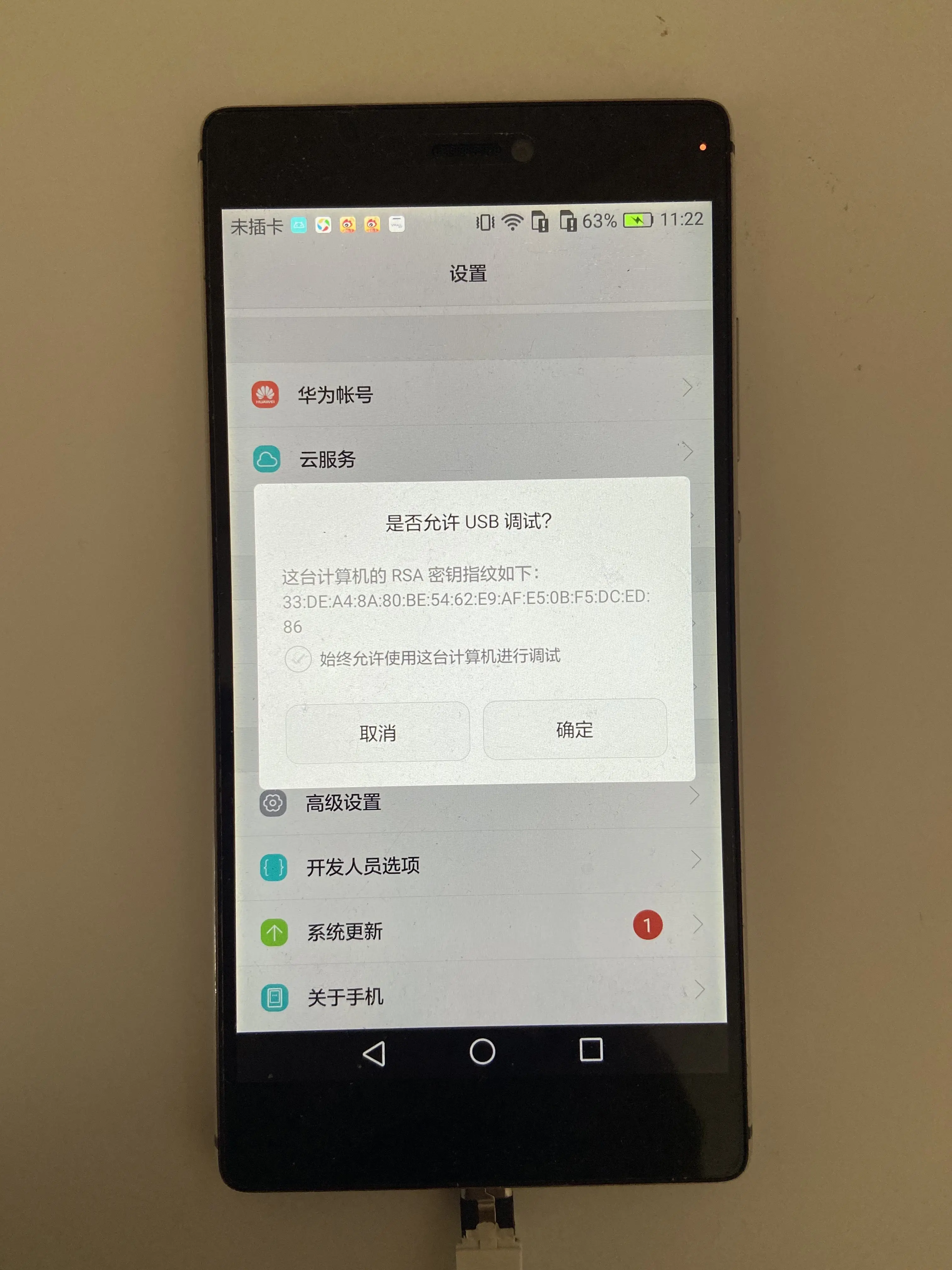 首次链接设备时,安卓设备上一般会有弹框授权是否允许USB调试,如下图,选择始终允许即可:
