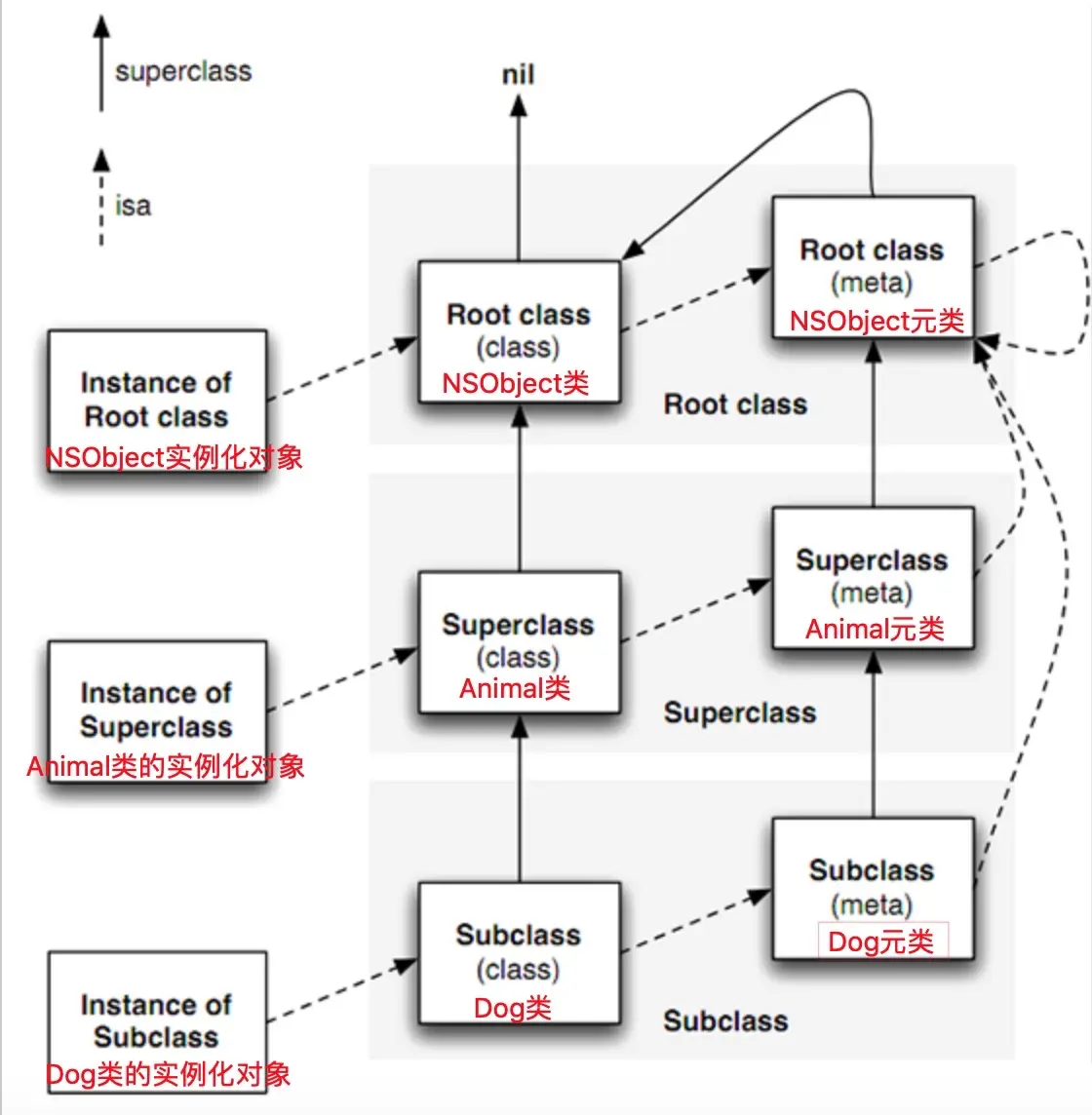 总结: isa走位: 实例对象 -> 类 -> 元类 -> 根元类 <-> 根元类 例: test -> MyTest -> MyTest(元类) -> NSObject(元类) <-> NSObject(元类)