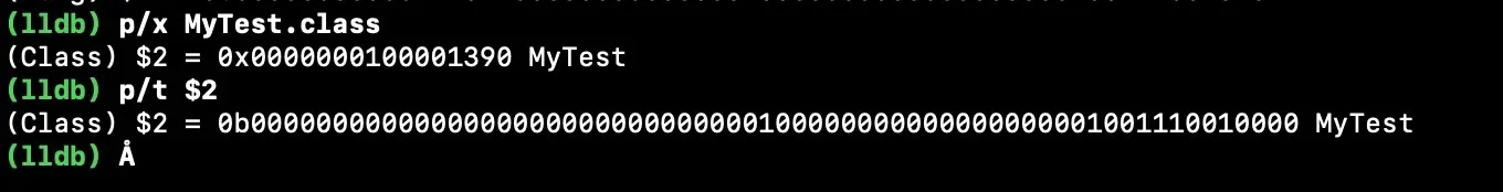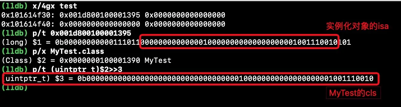 可以看到底层是创建一个newisa, isa与cls关联就是cls向右平移了三位等于isa的shiftcls属性 那么在之前我们打印的 MyTest二进制数据向右平移三位