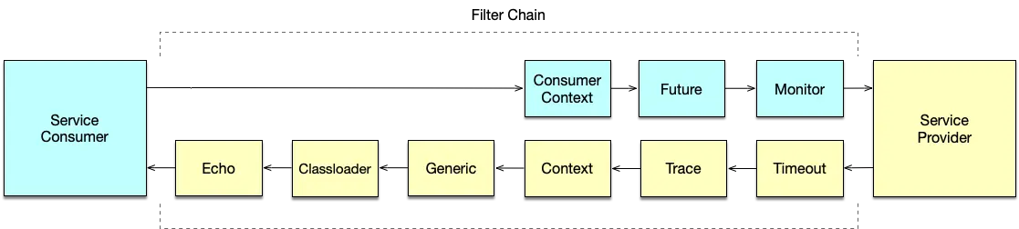 与真正的本地方法调用不同的是,Dubbo 本地调用会经过 Filter 链,其中包括了 Consumer 端的 Filter 链以及 Provider 端的 Filter 链。通过这样的机制,本地消费者和其他消费者都是统一对待,统一监控,服务统一进行治理。