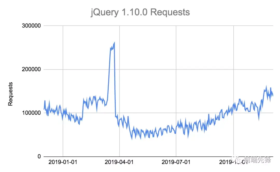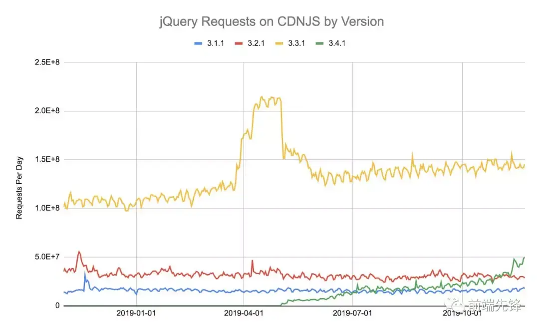 如果你感到好奇,那么 jQuery CDNJS 包含的最旧版本是 2013 年 5 月 25 日发布的 1.10.0。该项目平均每天仍收到 10 万个请求,并且使用它的网站越来越受欢迎: