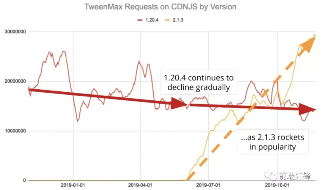3.4.1 版在 2019 年 5月2日发布之后,我们看到了稳定的增长。但是看不到旧版本的大幅下降。版本 3.2.1 在图例开始时显示平均需求为 3600 万个请求,而在结束时平均显示为 2900 万,下降了大约 20%。这与研究机构(http://informationr.net/ir/9-2/paper174.html#2002)发布的数据一致,后者显示平均网站持续使用时间为两到四年。我们并没有看到旧版本下降的数量接近新版本发布时增长的数量。实际上 3.4.1 的发行版虽然很快就流行了,但丝毫没有改变旧版本的弃用趋势。