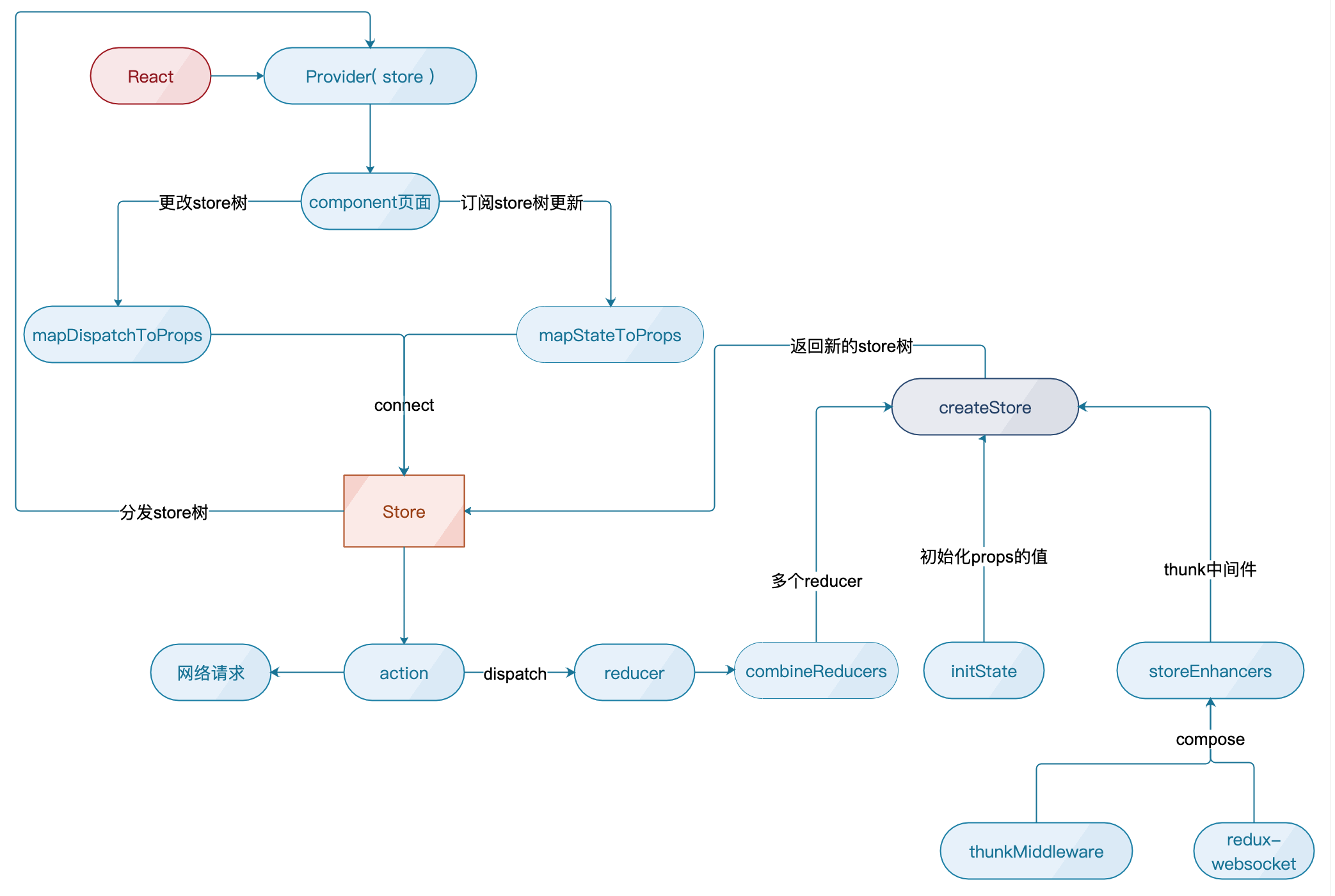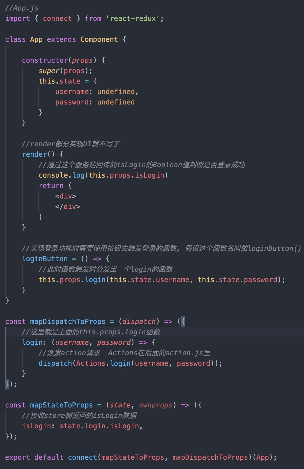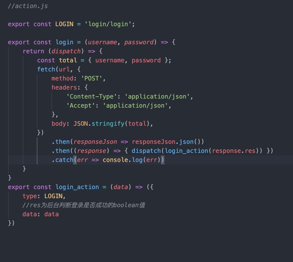 当点击登录按钮以后触发this.props.login事件,事件被传到store树后返回到mapStateToProps里再去触发action请求,然后把服务端返回数据dispatch到reducer中。