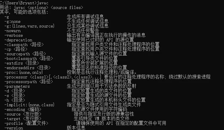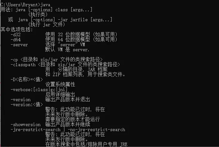 命令行窗口(Win + R)输入Java 跟 Javac,如果出现以下代码即代表Java环境安装成功