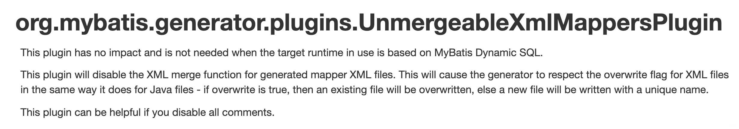 <plugin type="org.mybatis.generator.plugins.UnmergeableXmlMappersPlugin" />