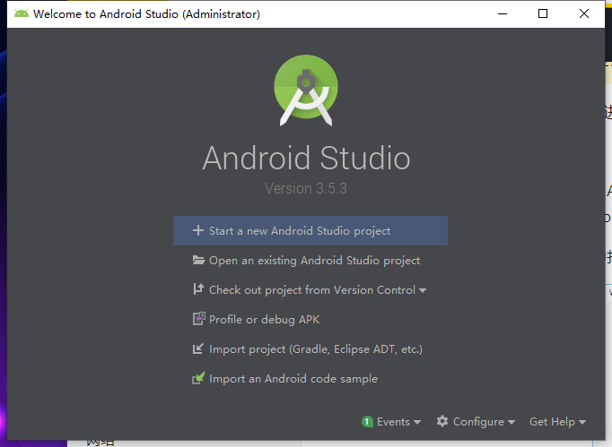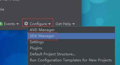 - Android Studio 的欢迎界面中找到 SDK Manager。点击"Configure",然后就能看到"SDK Manager"。
