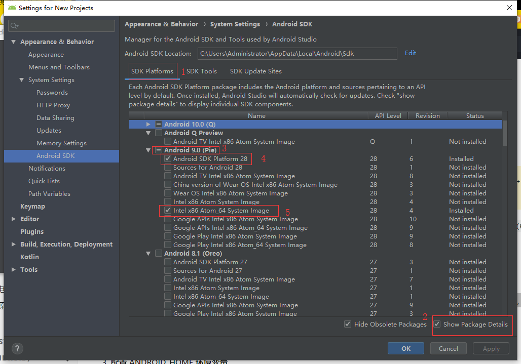 2.在 SDK Manager 中选择"SDK Platforms"选项卡,然后在右下角勾选"Show Package Details"。展开Android 9 (Pie)选项,确保勾选了下面这些组件(重申你必须使用稳定的翻墙工具,否则可能都看不到这个界面):