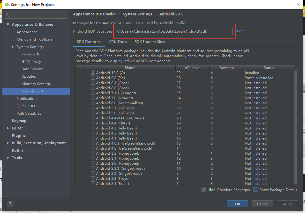 Android Studio 默认会安装最新版本的 Android SDK。目前编译 React Native 应用需要的是Android 9 (Pie)版本的 SDK(注意 SDK 版本不等于终端系统版本,RN 目前支持 android4.1 以上设备)。你可以在 Android Studio 的 SDK Manager 中选择安装各版本的 SDK。