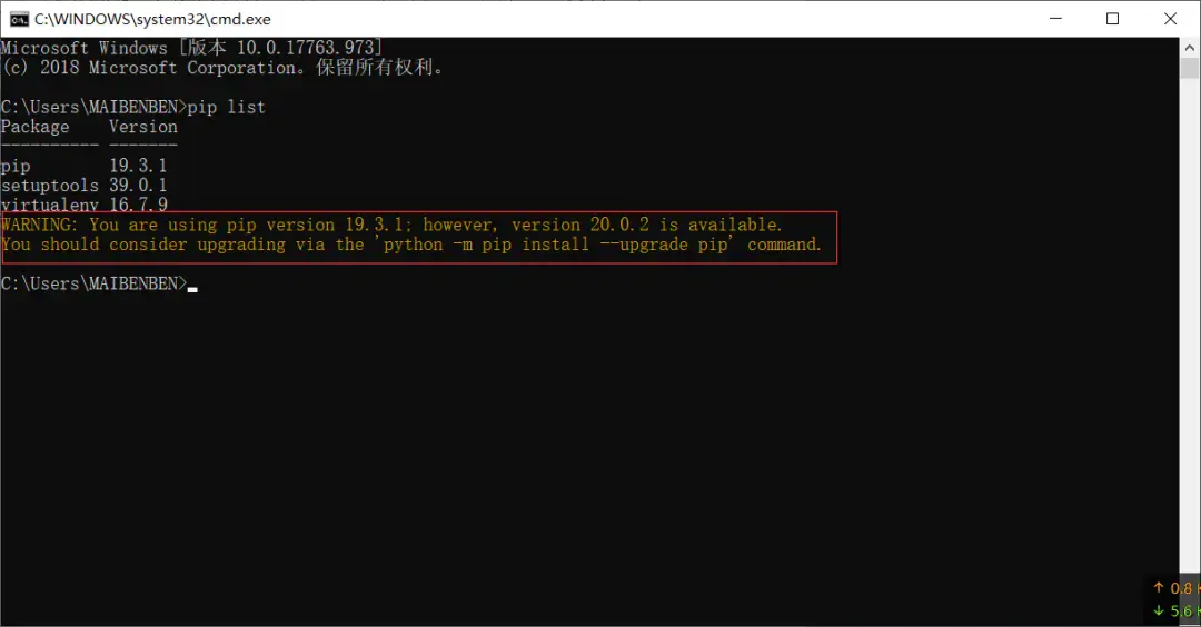 上次我们学会了,如何配置虚拟环境。这里呐,要补充一点点,我们每次在创建新的虚拟环境之前,先在真实环境中执行一下 pip list,看一下我们的pip用不用更新一下,就像这样,如下图所示。