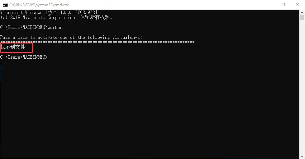 5、重新打开一个cmd,不打开是不行的,然后执行workon,就会发现,success,如下图所示。