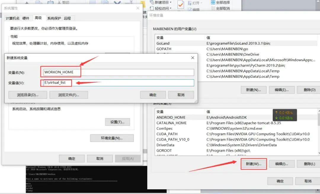 4、然后呢,我们新建有一个变量名叫 WORKON_HOME ,变量值就是我们专门用户存放虚拟环境的文件夹地址,然后点击保存保存,一直确定即可,如下图所示。