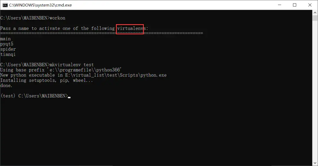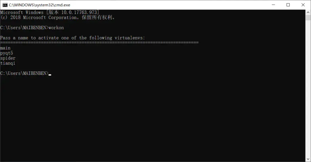 这不,不管在哪,只要执行workon,就可以列出所有的虚拟环境。