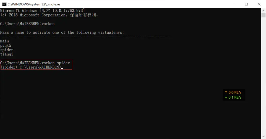 6、好了,可能出现的坑解决了,继续正文。进入虚拟环境 -> workon 虚拟环境名,如下图所示。前面有括号,就表示进入了该虚拟环境。