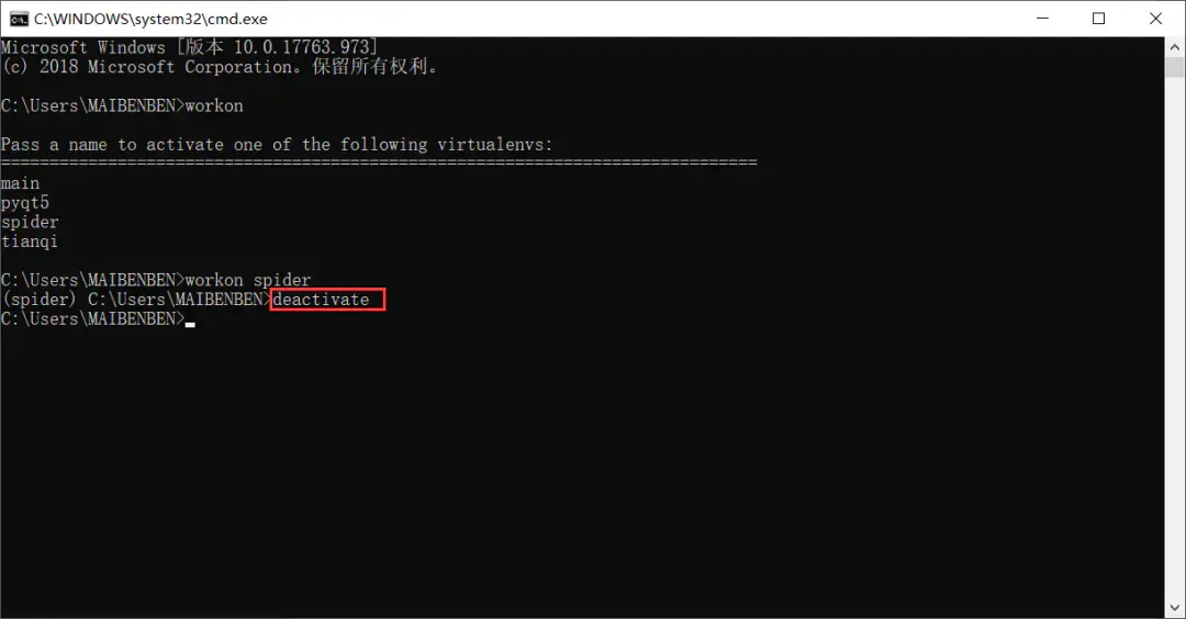 7、如果想退出当前虚拟环境 -> deactivate,如下图所示。