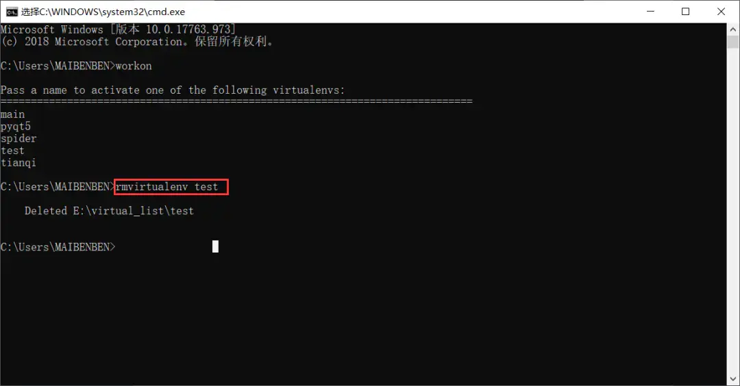 9、删除虚拟环境 -> rmvirtualenv 环境名,如下图所示。