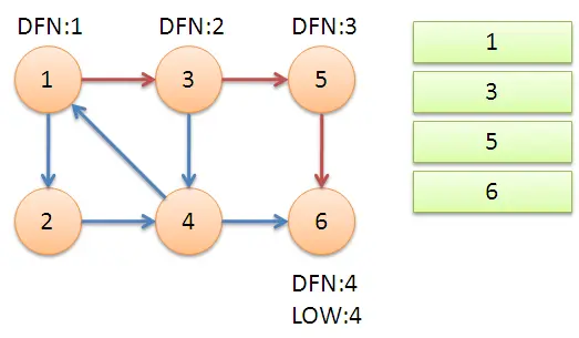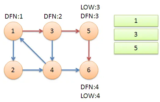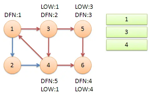 - 返回节点3,继续搜索到节点4,把4加入堆栈。发现节点4向节点1有后向边,节点1还在栈中,所以LOW[4]=1。节点6已经出栈,(4,6)是横叉边,返回3,(3,4)为树枝边,所以LOW[3]=LOW[4]=1。
