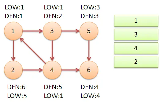 - 继续回到节点1,最后访问节点2。访问边(2,4),4还在栈中,所以LOW[2]=DFN[4]=5。返回1后,发现DFN[1]=LOW[1],把栈中节点全部取出,组成一个连通分量{1,3,4,2}。