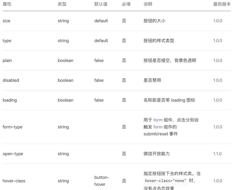 <button bindtap='' size='' type='' plain='' disabled=false open-typ='' hover-class='' .... />