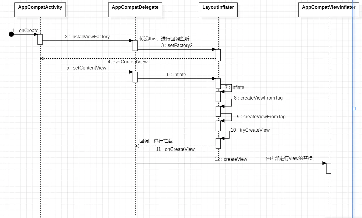 Activity和AppCompatActivity的onCreate中的setContentView方法的执行流程是不一样的。在继承AppCompatActivity的情况下,如果xml中使用了例如TextView,那么会自动的替换成AppCompatTextView。而且创建的方式是通过反射。 是通过LayoutInflater的setFactory2的方法进行了拦截。