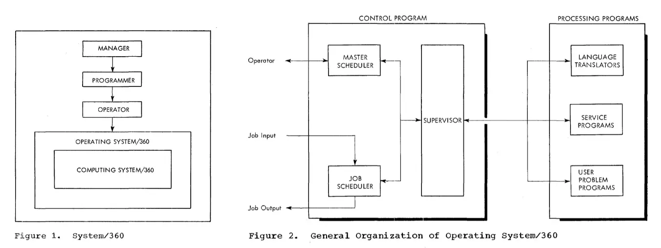 (a)OS/360(1966)的组织结构。 左图可以清楚看出 IBM 将用户对机器的访问进行分层的哲学;右图是 OS/360 内部的层级 结构,可以看到 supervisor 位于最中间的位置。