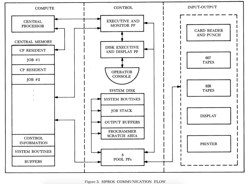 60 年代中期的某些操作系统并没有遵循这种层级结构(hierarchical structure),大部 分是因为它们主打多道编程和/或(实时)交互,例如,Univac’s EXEC I (1962) 的核心组件是一个通 信处理器(communication processor)和一个调度例程(scheduling routine); CDC’s SIPROS system (1965) 有一组外设处理器(a pool of peripheral processors), 这些处理器在 monitor 的管理下执行 I/O 或顺序化(sequencing)工作。