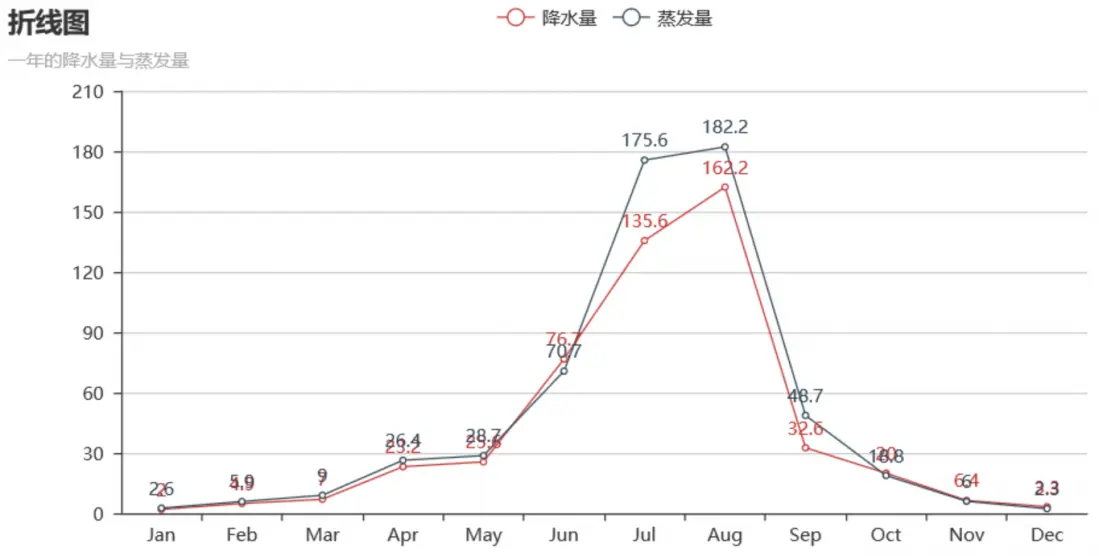 1 2 3 4 5 6 | from pyecharts import Lineline = Line("折线图","一年的降水量与蒸发量")//is_label_show是设置上方数据是否显示line.add("降水量", columns, data1, is_label_show=True)line.add("蒸发量", columns, data2, is_label_show=True)line.render() |