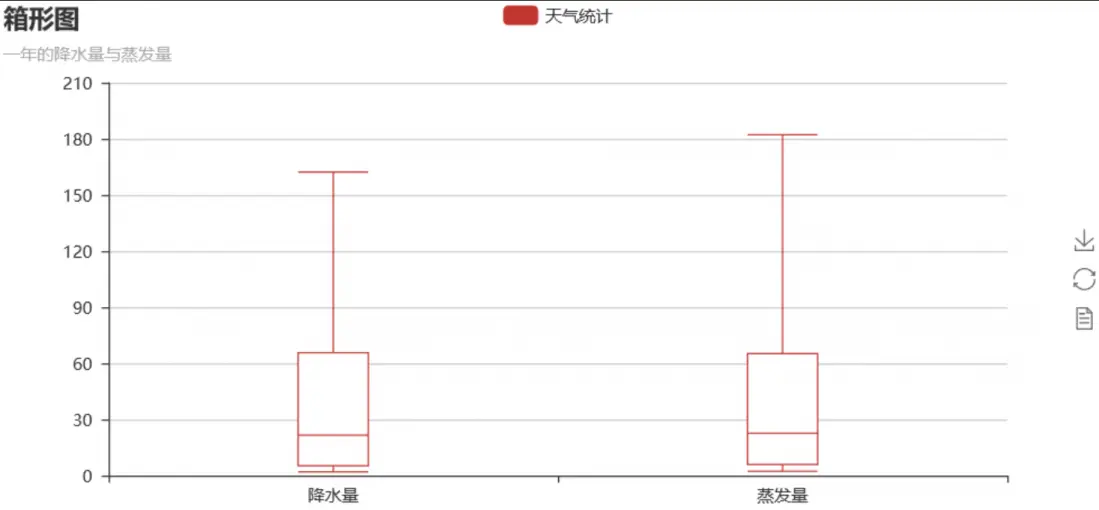 1 2 3 4 5 6 7 8 9 | //导入箱型图Boxplotfrom pyecharts import Boxplot boxplot = Boxplot("箱形图", "一年的降水量与蒸发量")x_axis = ['降水量','蒸发量']y_axis = [data1,data2]//prepare_data方法可以将数据转为嵌套的 [min, Q1, median (or Q2), Q3, max]yaxis = boxplot.prepare_data(y_axis) boxplot.add("天气统计", x_axis, _yaxis)boxplot.render() |