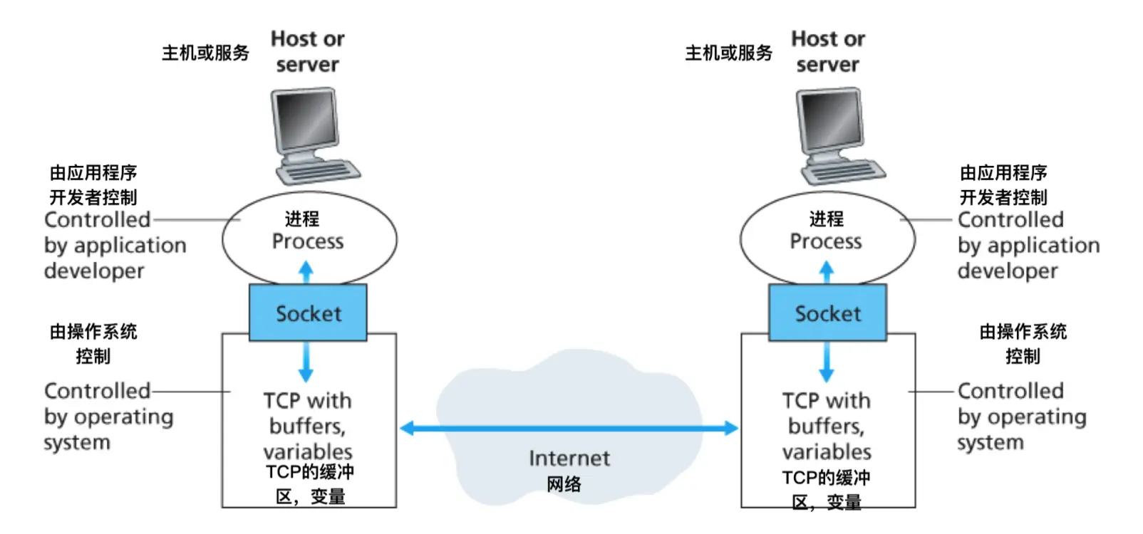 从图可以看到,Socket 属于主机或者服务进程的内部接口,由应用程序开发人员进行控制,两台端系统之间进行通信会通过 TCP 的缓冲区经由网络传输到另一个端系统的 TCP 缓冲区,Socket 从 TCP 缓冲区读取报文供应用程序内部使用。