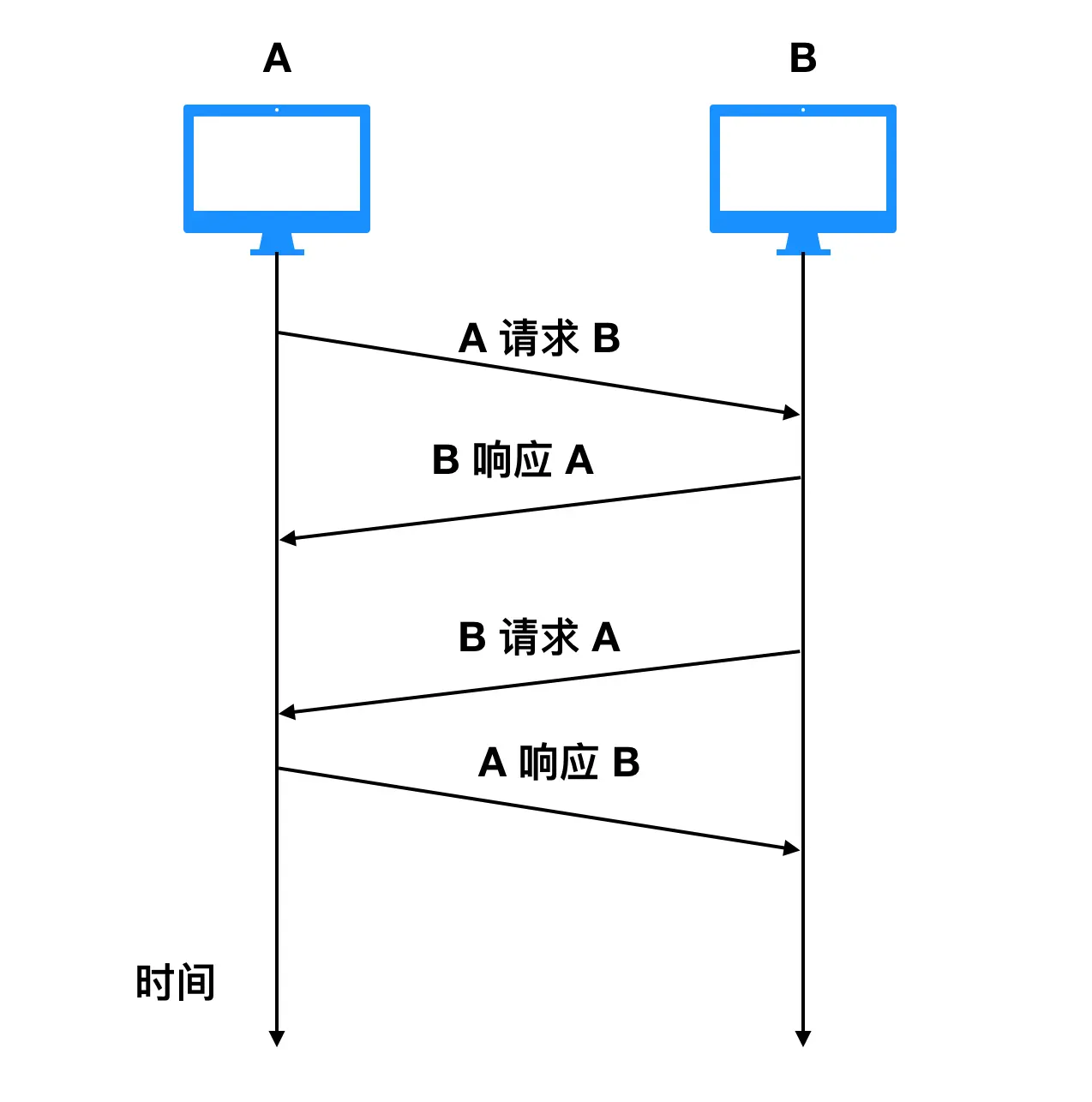 如图所示,A 和 B 是两个不同的端系统,它们之间可以作为信息交换的载体存在,刚开始的时候是 A 作为请求方请求与 B 交换信息,B 作为响应的一方提供信息;随着时间的推移,B 也可以作为请求方请求 A 交换信息,那么 A 也可以作为响应方响应 B 请求的信息。