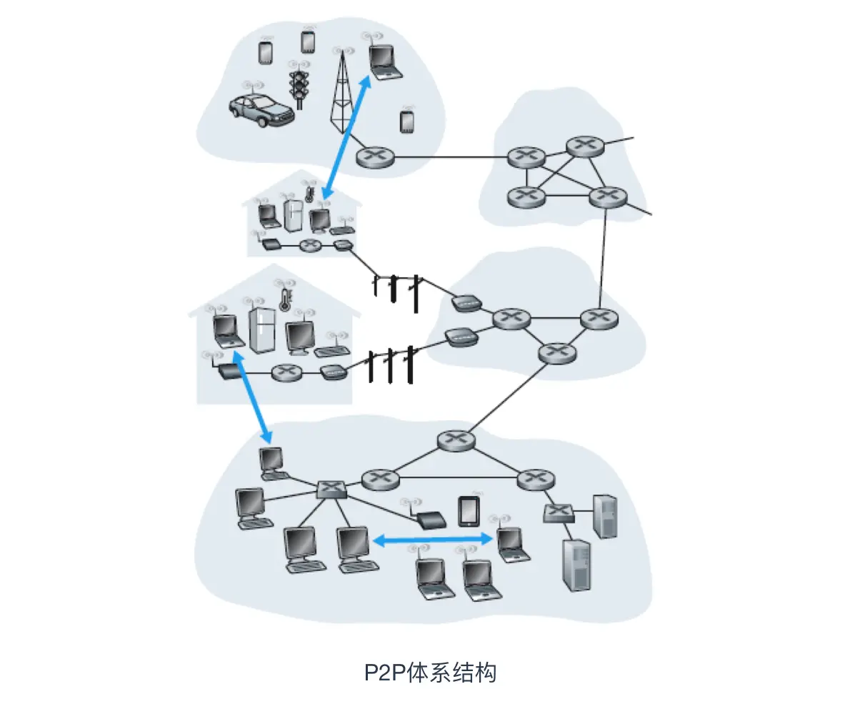 另外一种体系结构是 P2P体系结构(P2P architecture),相对于对数据中心有过多依赖的客户-服务器体系结构,P2P 体系结构则直接通过两台相连的主机直接通信,这些主机称为对等方。典型的 P2P 体系结构的应用包括 文件共享(BitTorrent)、下载器(迅雷)、互联网电话和视频会议(Skype),下图显示了 P2P 体系结构图
