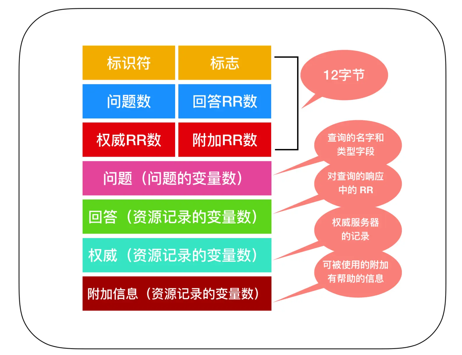 首部区域,也就是说首部区域有 12 个字节,第一个字段(标识符)是一个 16 比特的数,用于标示该查询。这个标识符会被复制到对查询的回答报文中,以便让客户用它来匹配发送的请求和接受到的回答。 标志字段含有若干标志,标志字段表示为 1 比特,它用于指出报文是 0-查询报文还是 1-响应报文。 -