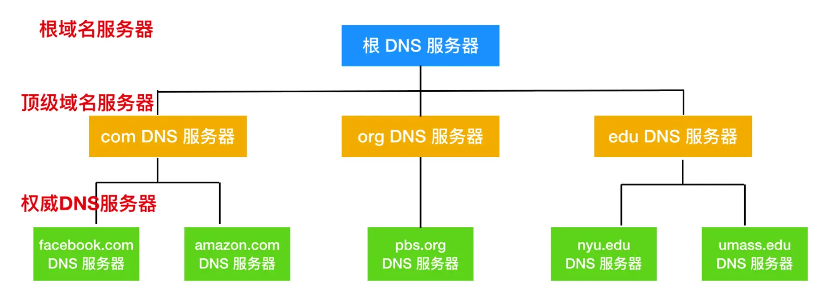 大致来说有三种 DNS 服务器:根 DNS 服务器、 顶级域(Top-Level Domain, TLD) DNS 服务器 和 权威 DNS 服务器 。这些服务器的层次模型如下图所示