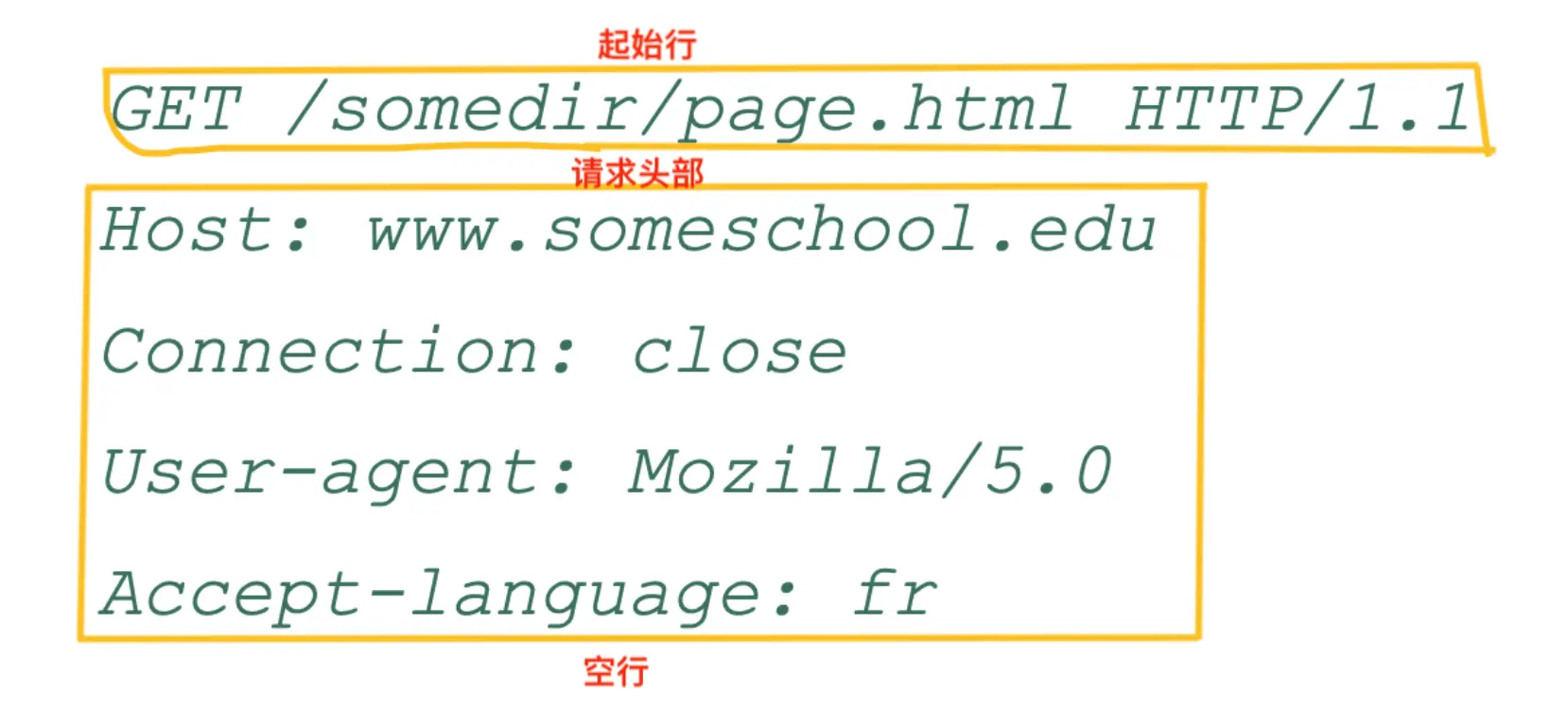 www.someSchool.edu所在的地址,然后 HTTP 客户端进程在 80 端口发起一个到服务器www.someSchool.edu的 TCP 连接(80 端口是 HTTP 的默认端口)。在客户和服务器进程中都会有一个套接字与其相连。 - HTTP 客户端通过它的套接字向服务器发送一个 HTTP 请求报文。该报文中包含了路径