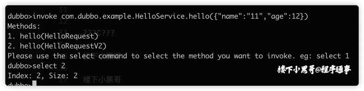 Dubbo 最新版本,如果服务存在多个相同参数的重载方法,且没有使用 class 来明确参数类型,提示用户使用新增的select 命令来选择要调用的方法。