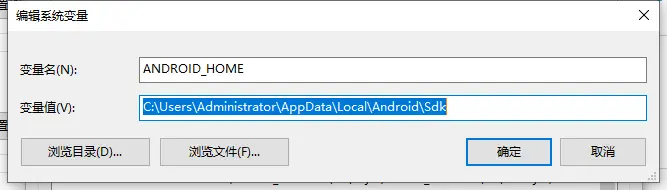 打开控制面板 -> 系统和安全 -> 系统 -> 高级系统设置 -> 高级 -> 环境变量 -> 新建,创建一个名为ANDROID_HOME的环境变量(系统或用户变量均可),指向你的 Android SDK 所在的目录(具体的路径可能和下图不一致,请自行确认):