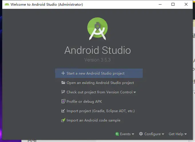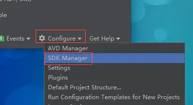 - Android Studio 的欢迎界面中找到 SDK Manager。点击"Configure",然后就能看到"SDK Manager"。