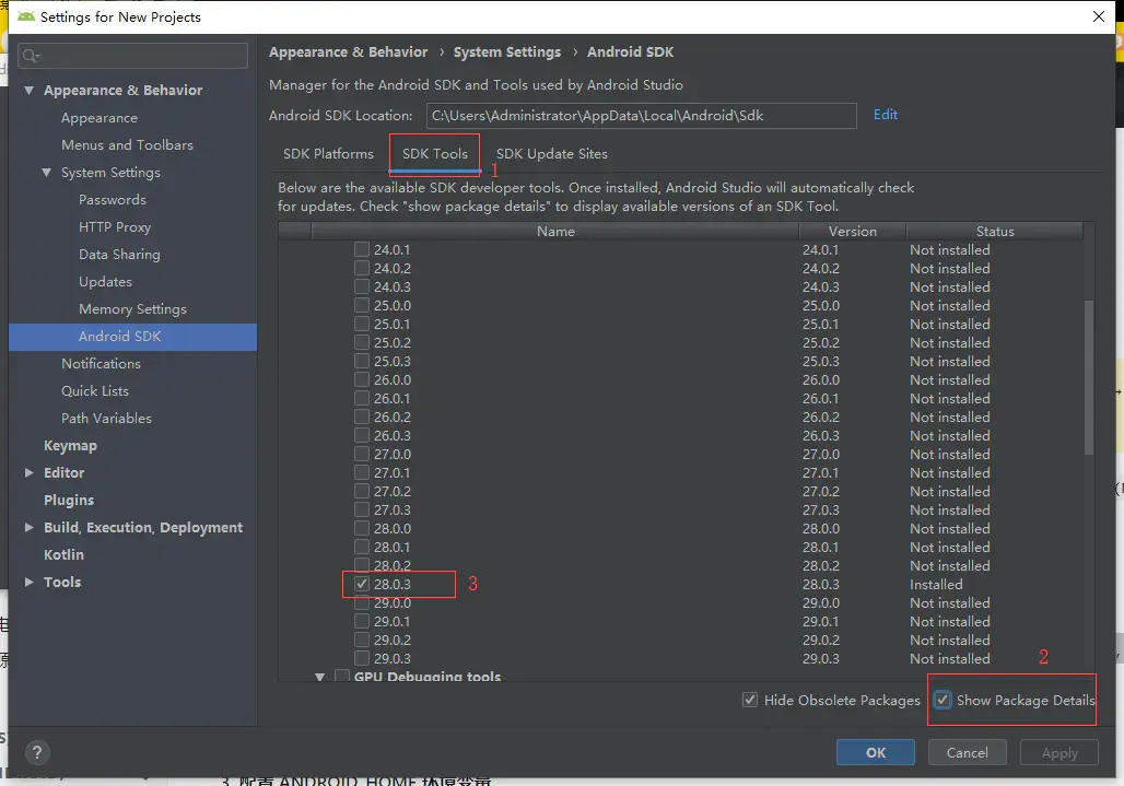 3.然后点击"SDK Tools"选项卡,同样勾中右下角的"Show Package Details"。展开"Android SDK Build-Tools"选项,确保选中了 React Native 所必须的28.0.3版本。你可以同时安装多个其他版本。