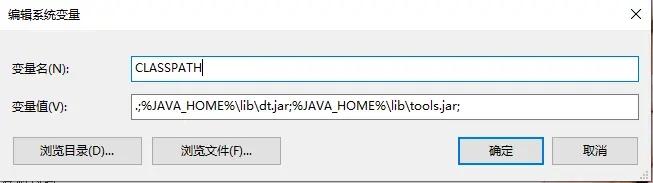 变量值 .;%JAVA_HOME%\lib\dt.jar;%JAVA_HOME%\lib\tools.jar;(标点符号全部带上)