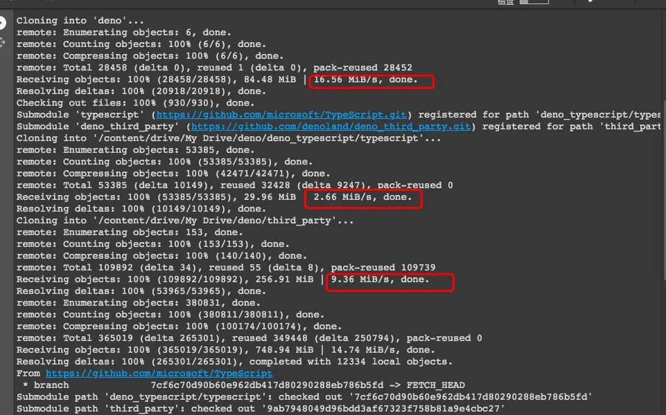 注意:这里必须使用--recurse-submodules参数,原因是deno将多个仓库作为了子模块进行开发,包括deno_std和third_party等等。