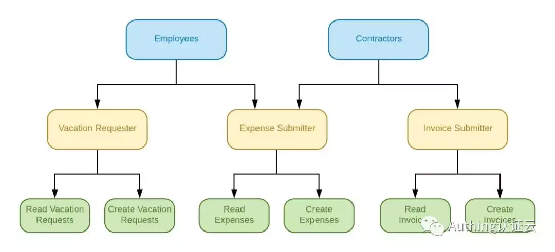当使用 RBAC 时,通过分析系统用户的实际情况,基于共同的职责和需求,将他们分配给不同的角色。然后可以授予每个用户一个或多个角色,每个角色具有一个或多个权限,这种 用户-角色、角色-权限 间的关系,让我们可以不用再单独管理单个用户,用户从具备的角色里面继承所需的权限,从而使得用户赋权这件事变得更加简单。