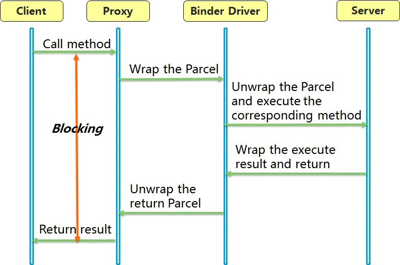 - Client调用某个代理接口中的方法时,代理接口的方法会将Client传递的参数打 包成Parcel对象。