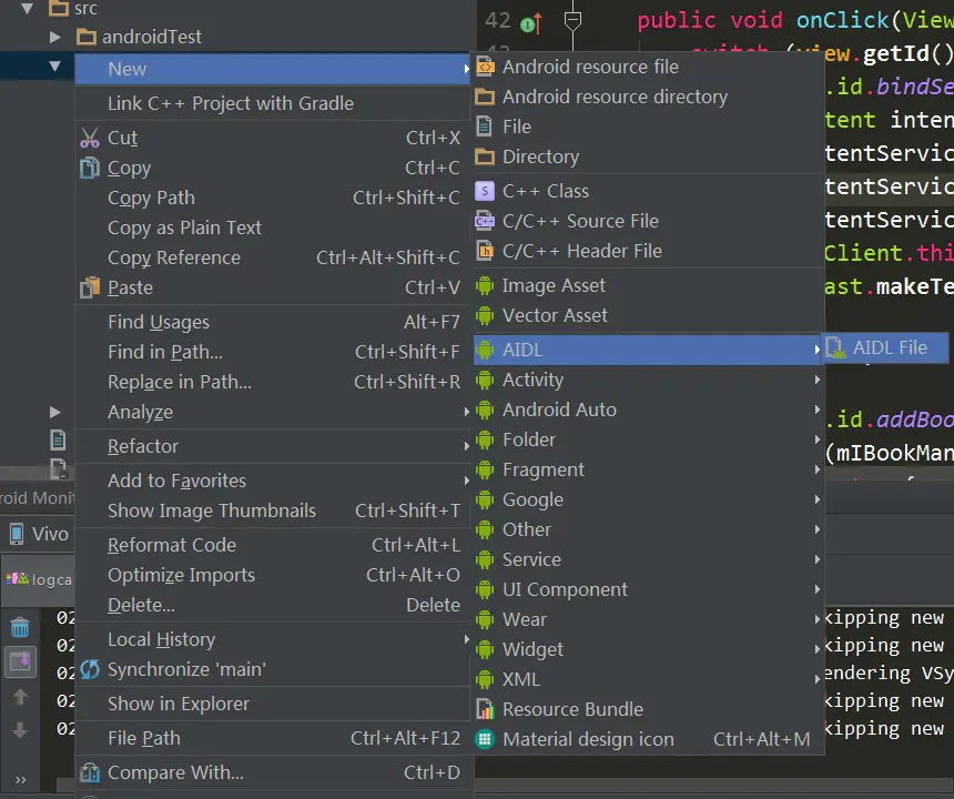 首先将服务端工程中的aidl文件夹下的内容整个拷贝到客户端工程的对应位置下, 由于本例的使用在一个应用中,就不需要拷贝了,其他情况一定不要忘记这一步。
