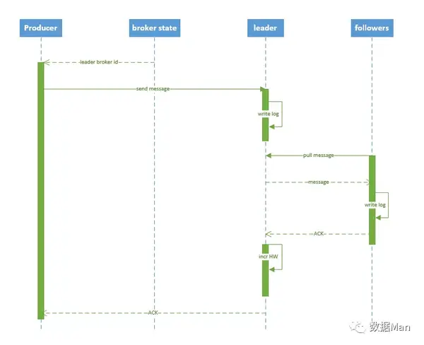 - leader 收到所有 ISR 中的 replica 的 ACK 后,增加 HW(high watermark,最后 commit 的 offset) 并向 producer 发送 ACK