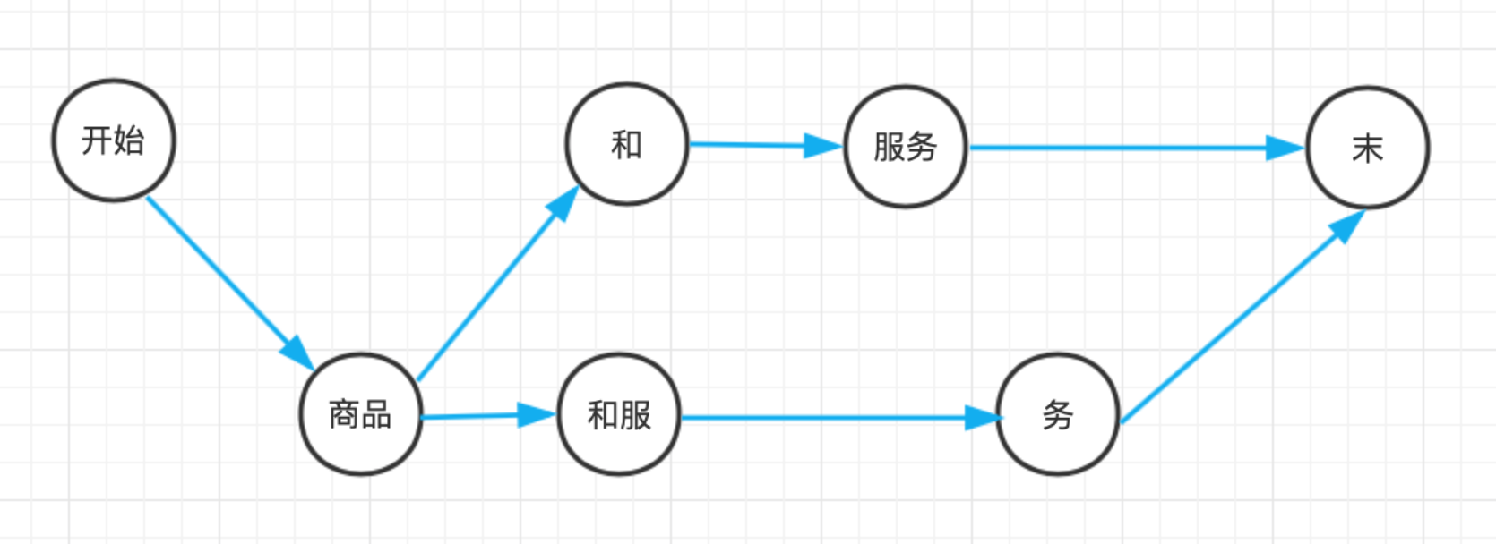 0:[ ] 1:[商品] 2:[] 3:[和,和服] 4:[服务] 5:[务] 6:[ ]其中收尾(行0和行6)分别对应起始和末尾。词网必须保证从起点出发的所有路径都会连通到钟点房。