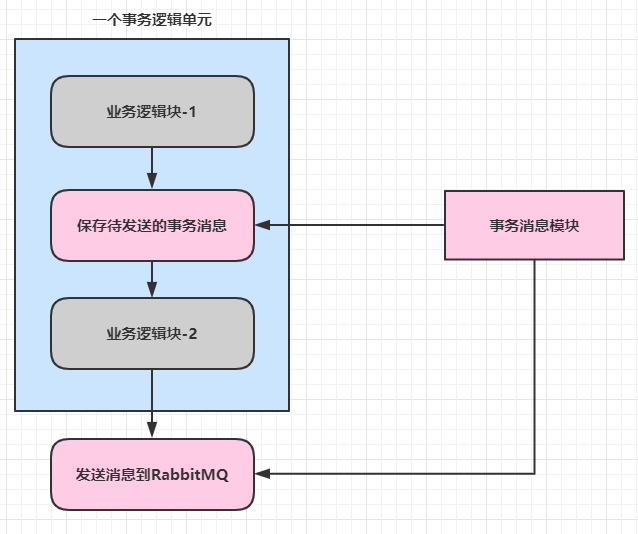 在事务执行的逻辑单元里面,需要进行待推送的事务消息记录的保存,也就是:「本地(业务)逻辑和事务消息记录保存操作绑定在同一个事务」。