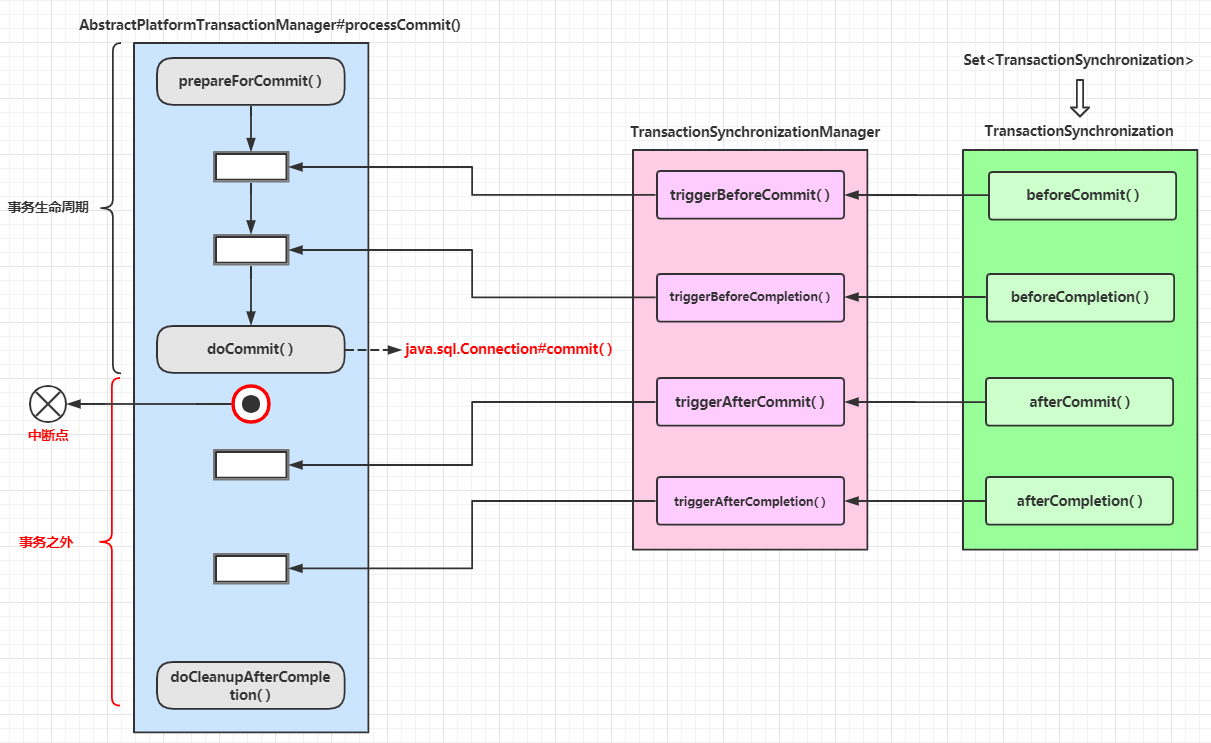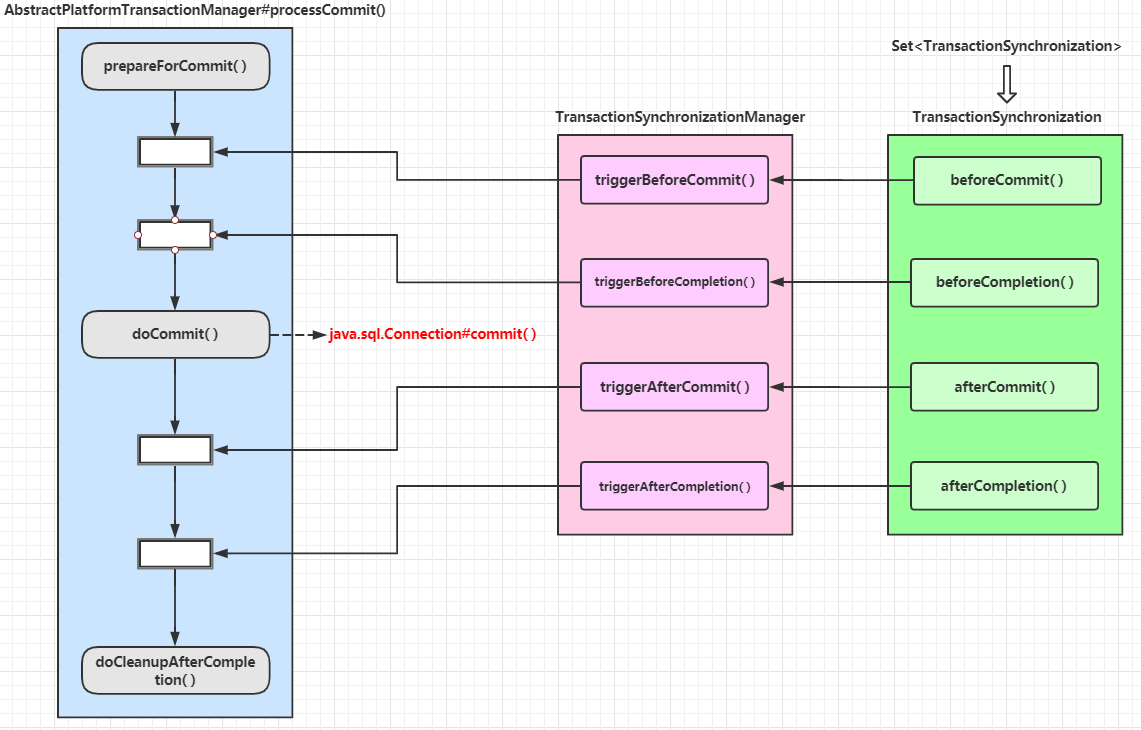 发送消息到RabbitMQ服务端这一步需要延后到「事务提交之后」,这样才能保证事务提交成功和消息成功发送到RabbitMQ服务端这两个操作是一致的。为了把「保存待发送的事务消息」和「发送消息到RabbitMQ」两个动作从使用者感知角度合并为一个动作,这里需要用到Spring特有的事务同步器TransactionSynchronization,这里分析一下事务同步器的主要方法的回调位置,主要参考AbstractPlatformTransactionManager#commit()或者AbstractPlatformTransactionManager#processCommit()方法: