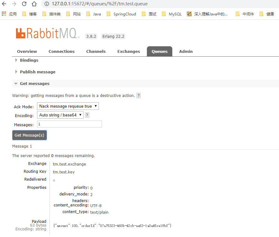 模拟订单数据成功保存,而且RabbitMQ消息在事务成功提交后正常发送到RabbitMQ服务端中,如RabbitMQ控制台数据所示。