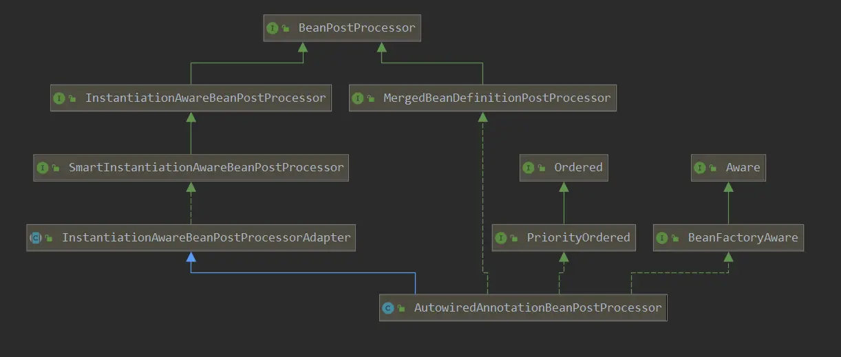 其中MergedBeanDefinitionPostProcessor的接口postProcessMergedBeanDefinition的实现,负责找到需要注入的属性